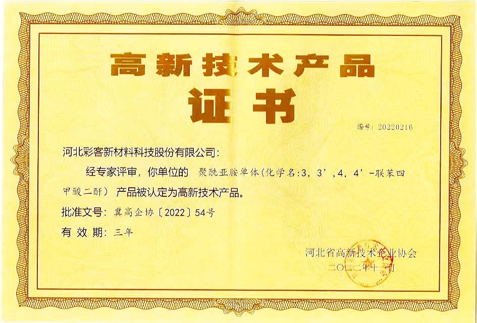 河北彩客新材料科技股份有限公司是一家專注于高性能精細化工產(chǎn)品研發(fā)、生產(chǎn)及銷售的高新技術企業(yè),主要產(chǎn)品為高性能有機顏料中間體(DMSS、DATA、DMS、DIPS)、食品添加劑中間體 DMAS、新材料聚合單體 BPDA 等。